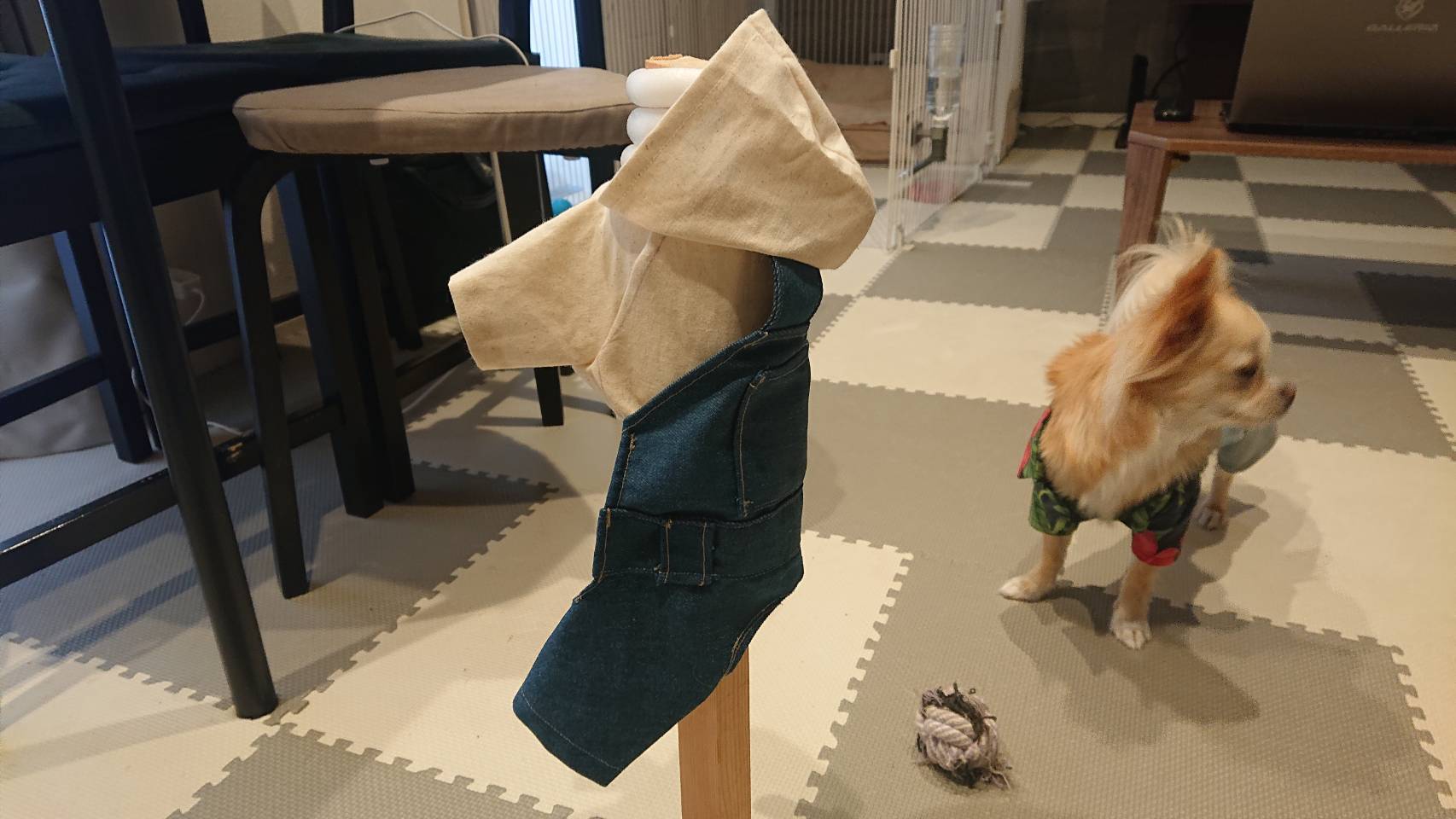 背中のポケットが大きめなので、おやつを入れることができます。麻素材のパーカーとデニム素材のサロペットはシンプルだけど他にはないお洒落な犬服に仕上げています。